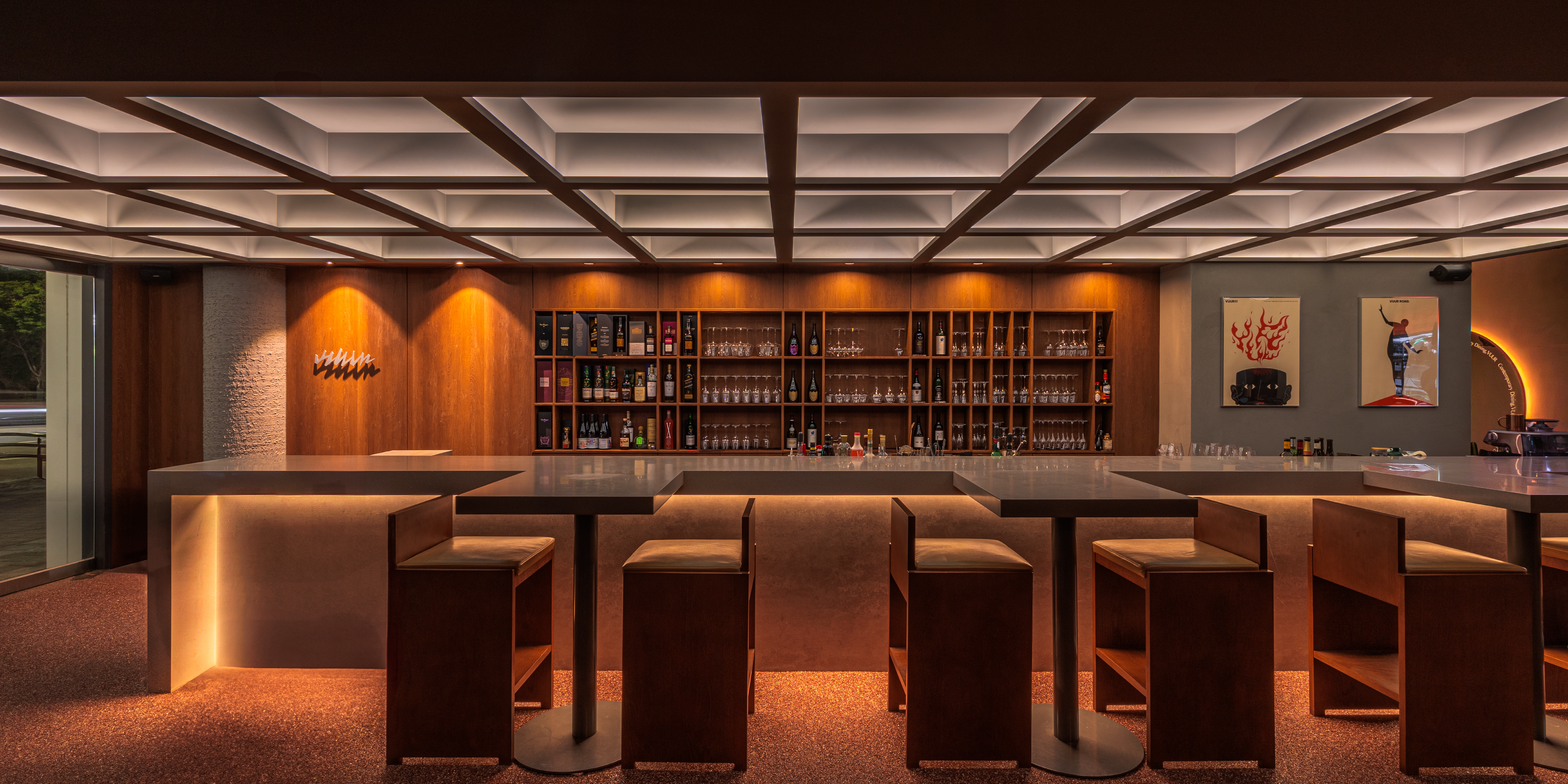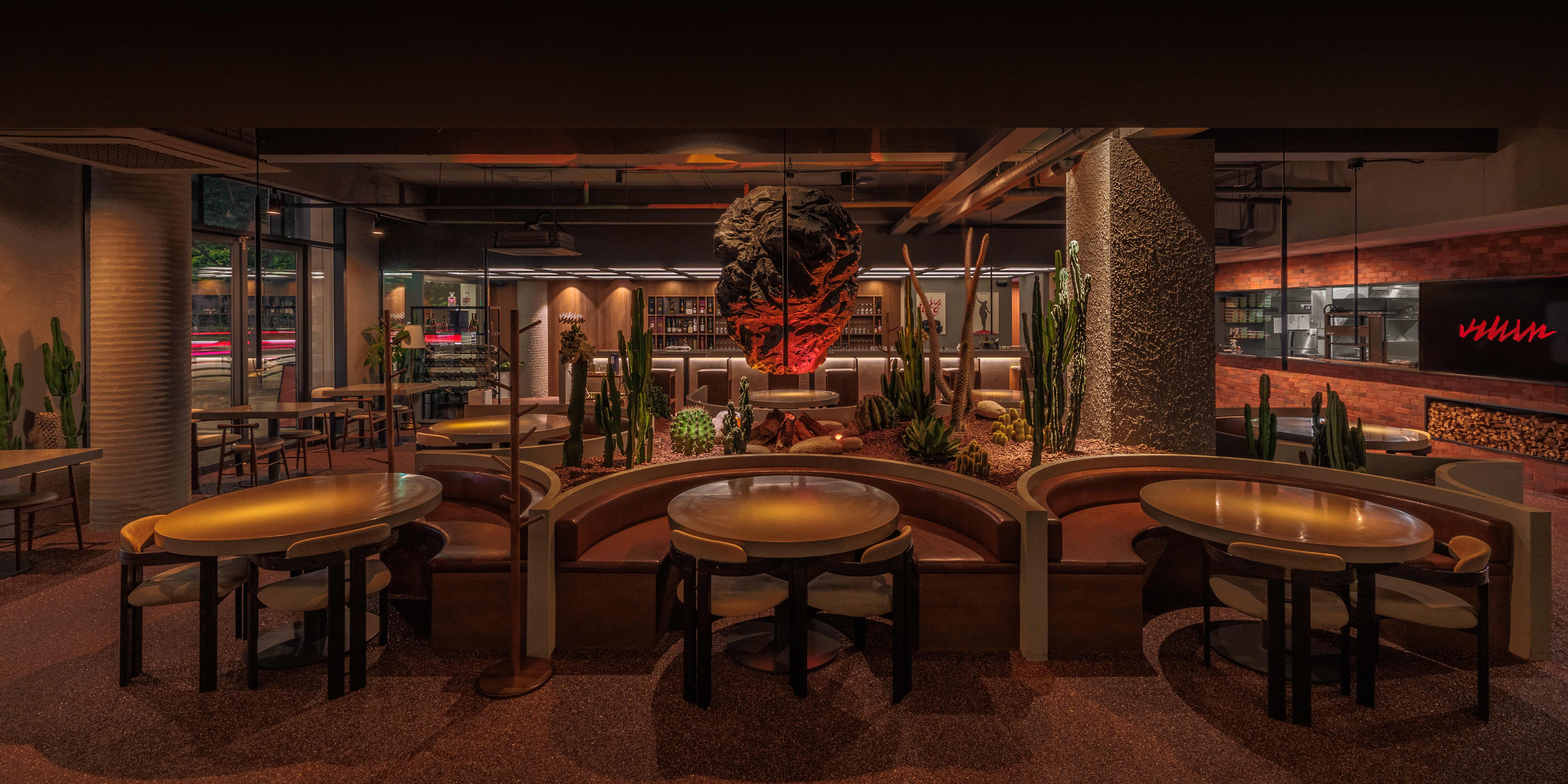 The space design mirrors this elemental theme, evoking fire and the wilderness. Paying homage to René Magritte’s “The Castle of the Pyrenees,” a large boulder is suspended at the center of the space, creating a dramatic focal point. Warmth is conveyed through campfire-inspired objects and brown-toned furniture and finishes. The circular tables and surrounding seating create a subtle contrast with the bar’s bold, linear design, while live cacti throughout the space add a wild, natural touch.