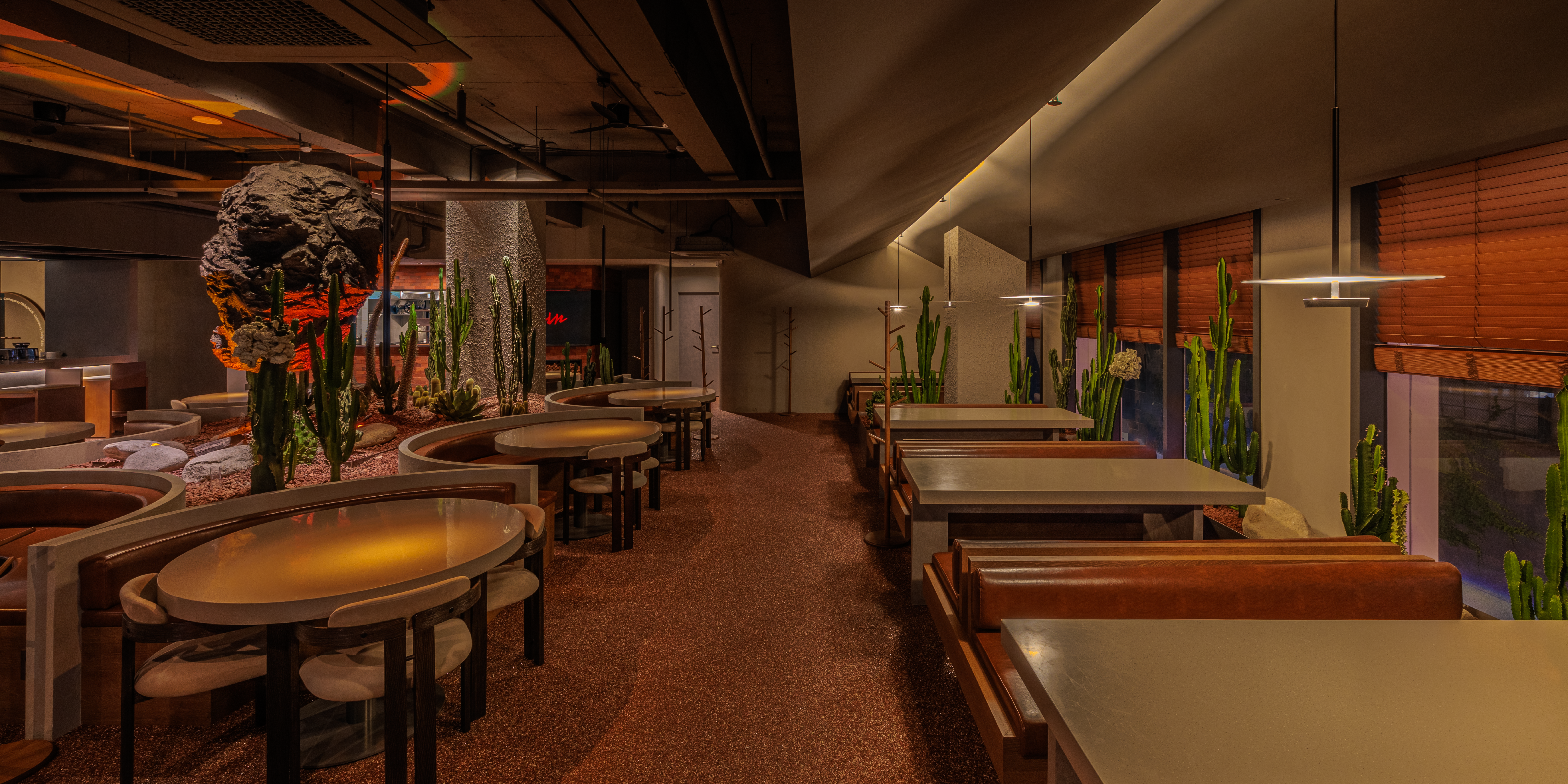르네 마그리트의 ‘피레네의 성’을 오마주해 공간 중앙의 공중에 대형 바위를 설치했으며, 모닥불 오브제와 브라운 톤의 가구 및 내장재로 불의 따스한 이미지를 표현했다. 원형 테이블과 이를 둘러싼 형태로 설계한 의자가 직선적 인상을 강조한 바와 미묘한 대조를 이룬다. 또한 매장 곳곳에 식재한 살아 있는 선인장으로 야생의 느낌을 강조했다.