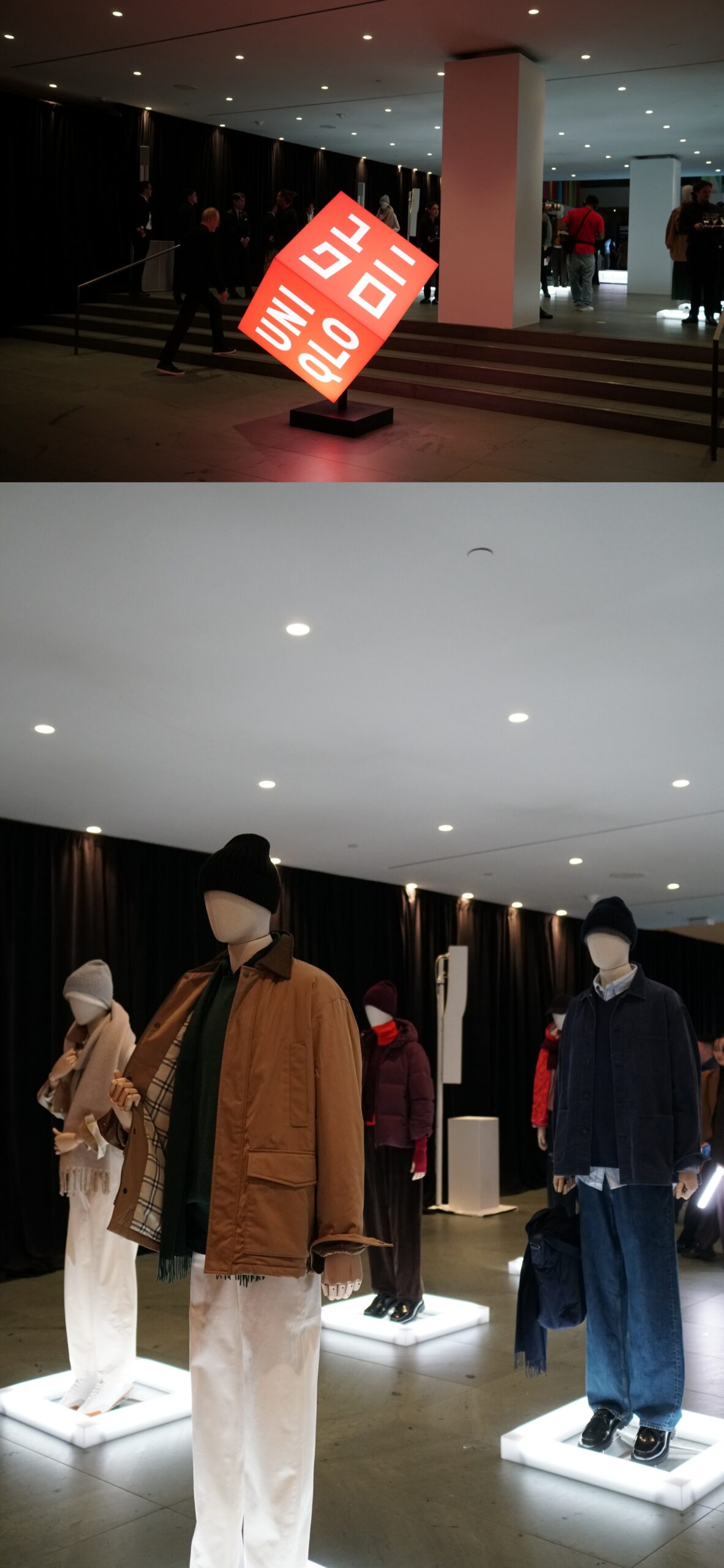 행사 당일, MoMA는 유니클로 기술력과 브랜드 철학을 소개하는 체험형 전시 공간으로 꾸며졌다. 로비 중앙에 놓인 붉은 유니클로 로고 구조물을 지나자, 2025 F/W 컬렉션을 착용한 토르소들이 군집을 이루듯 서 있었다. 바닥에 설치된 하얀 조명이 옷의 실루엣을 뚜렷하게 비췄고, 관람객들은 그 사이를 천천히 오가며 컬렉션의 디테일을 살폈다.