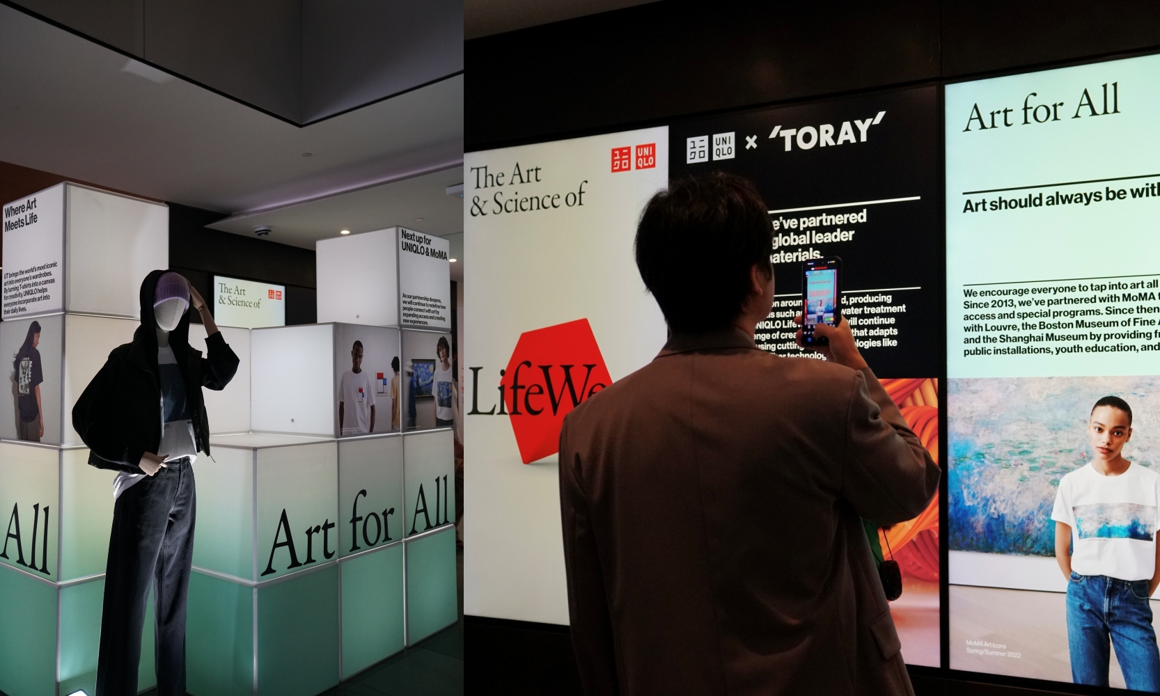 컬렉션 뒤로는 라이프웨어 철학을 예술(Art), 하트(Heart), 기술(Technology) 세 가지 관점으로 풀어낸 전시가 이어졌다. ‘모두를 위한 예술(Art For All)’은 유니클로와 MoMA의 파트너십을 기념하기 위해 구성됐다. 유니클로 UT를 착용한 마네킹 뒤로 지난 10여 년간 MoMA와 함께한 프로그램이 정리됐다. 예술의 문턱을 낮추기 위해 진행된 다양한 실험들은 패션을 넘어 예술과 일상이 교차하는 라이프웨어 철학의 지향점을 보여주고 있었다. 옆으로 이어진 ‘모두를 위한 하트(Heart For All)’는 유니클로가 진행해 온 다양한 기부 활동을 소개했다. 유니클로는 2006년부터 유엔난민기구(UNHCR)와 협력해 히트텍 등 의류 기부와 직업 훈련을 지원해 왔다. 옷을 통해 더 나은 삶을 만든다는 라이프웨어 철학은 예술을 넘어 사회적 실천으로도 확장되고 있었다.