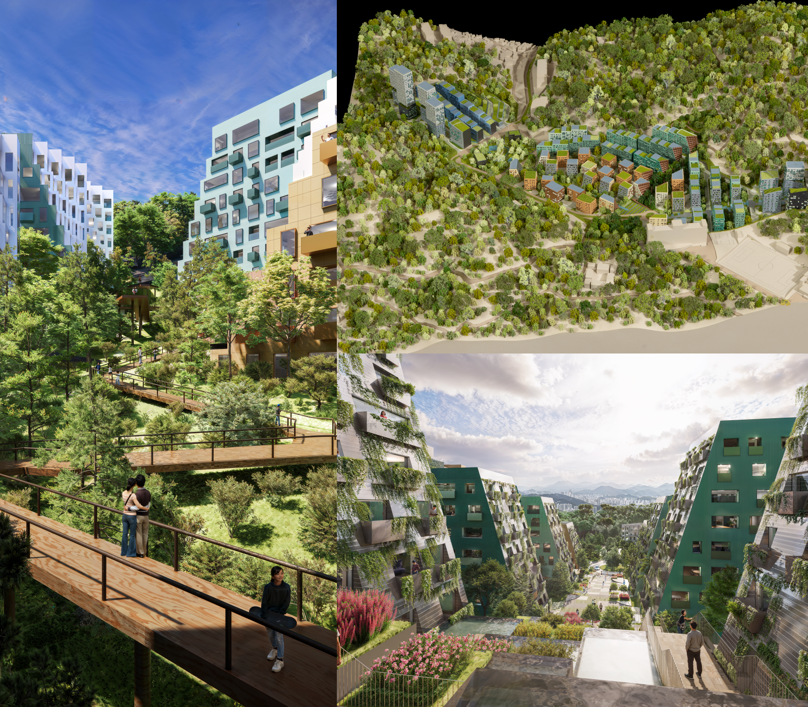 경사지를 밀지 않고, 지형을 활용해 다양한 주거 타입이 혼합된 구조를 만들었어요. 단차를 따라 테라스와 마당을 두고, 그 위에 테라스형, 타워형, 연속형 주거가 함께 놓인 시나리오로요.