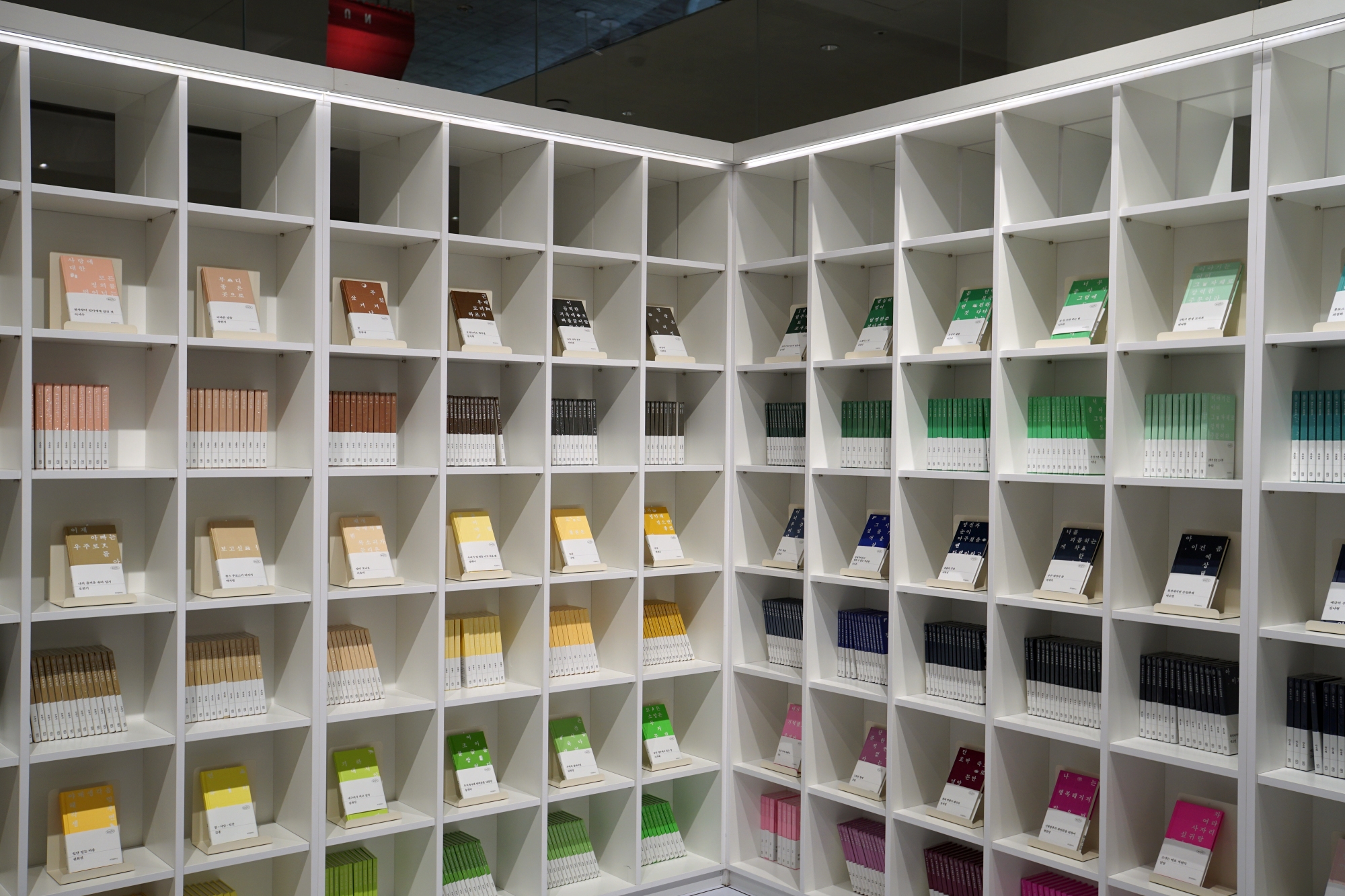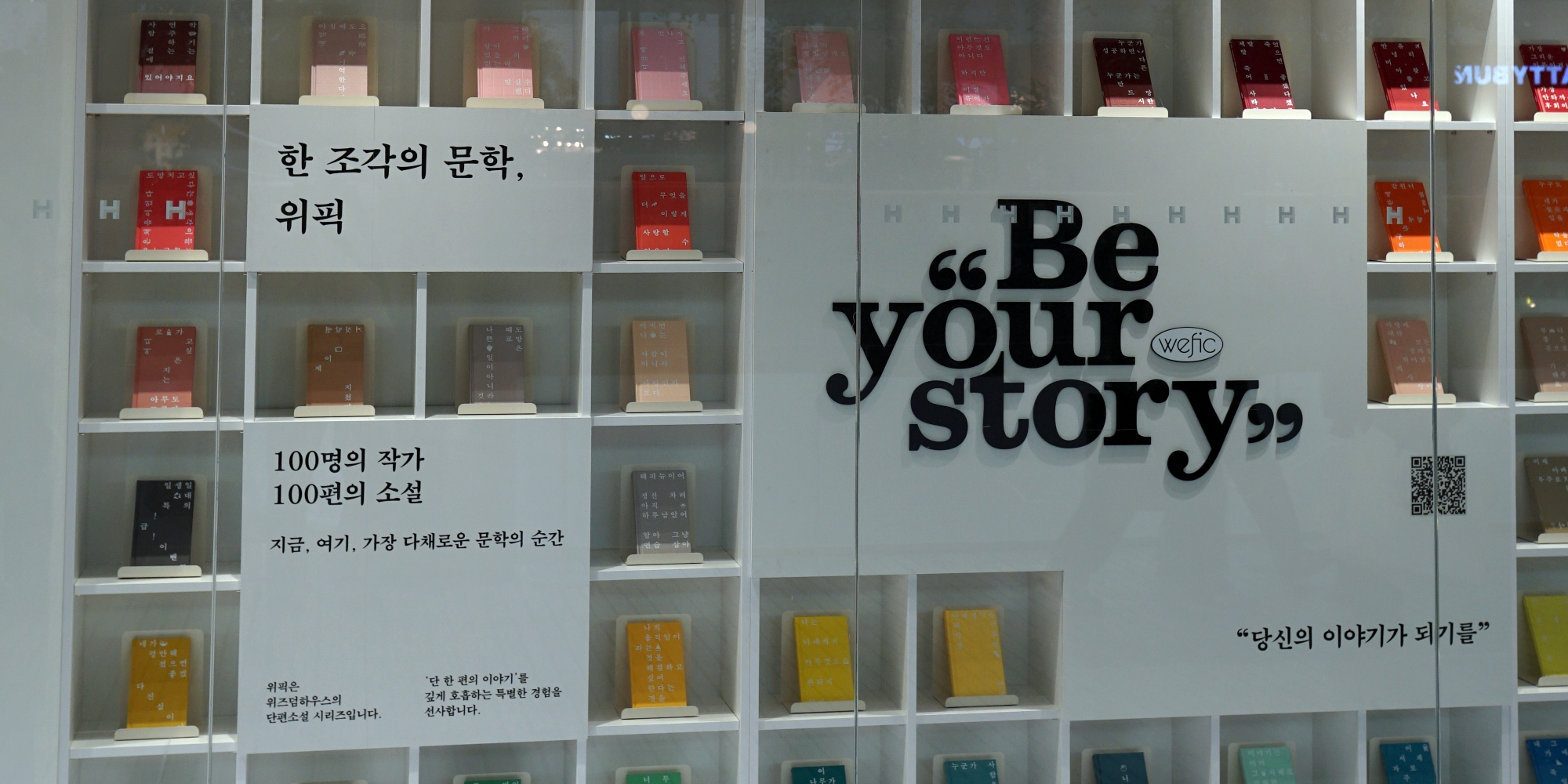 서재를 정리하는 방식은 크게 두 가지로 나뉜다. 작가나 장르로 분류하거나 다짜고짜 색상에 따라 정렬하거나. 미관적 통일감만을 중시하는 나는 전적으로 후자다. 멀리서부터 위즈덤하우스 부스에 마음이 동한 이유다. 하얀 책장에 꽂힌 위즈덤하우스 단편 시리즈 ‘위픽’이 표지 색에 따라 부드럽게 그라데이션을 이루고 있었다. 멀리서 보면 프리즘에 반사된 빛처럼 은은하게 번지는 색감이 아름답다. 심지어 하나의 시리즈로 완성된다니, 탐날 수밖에.