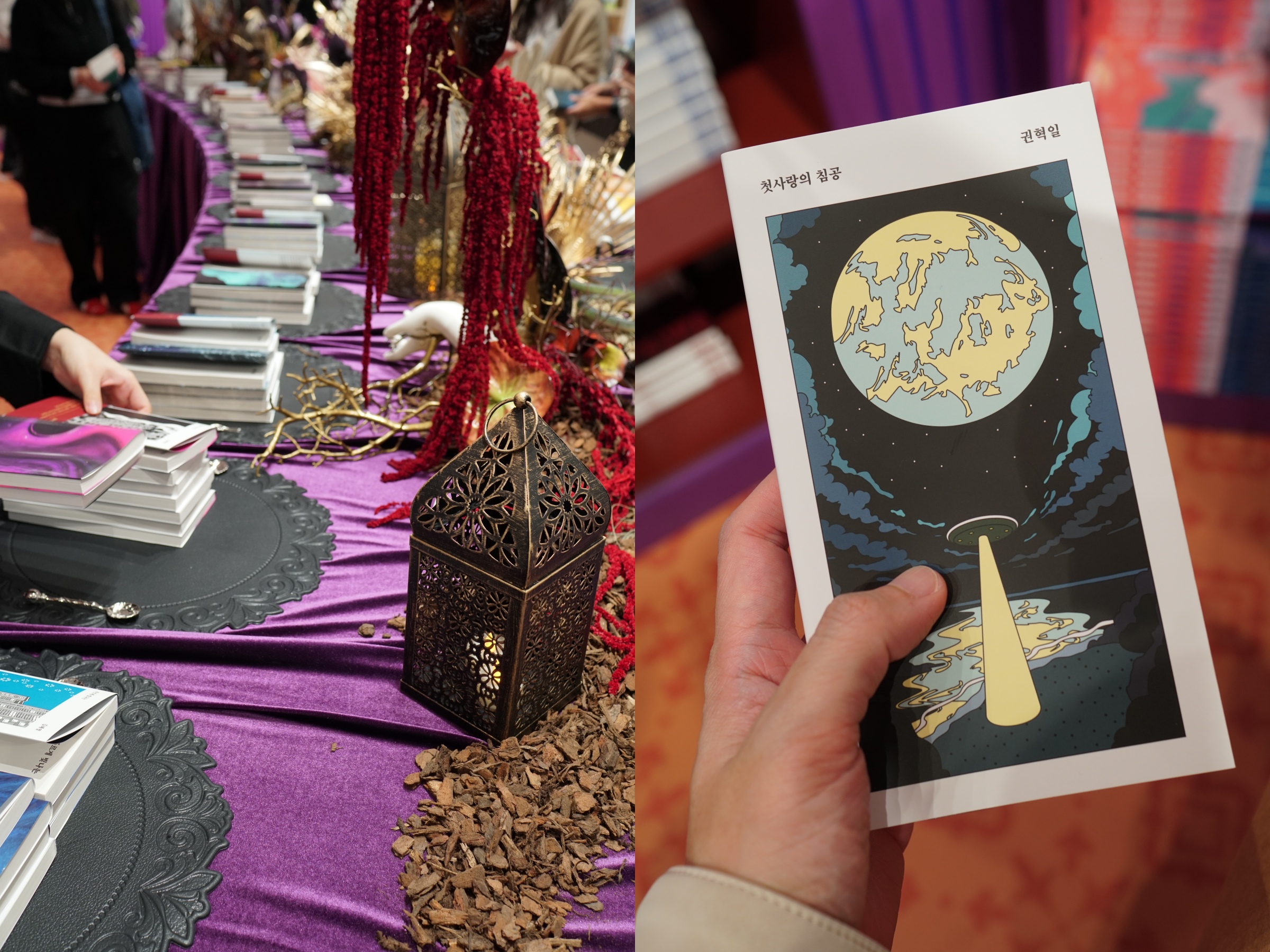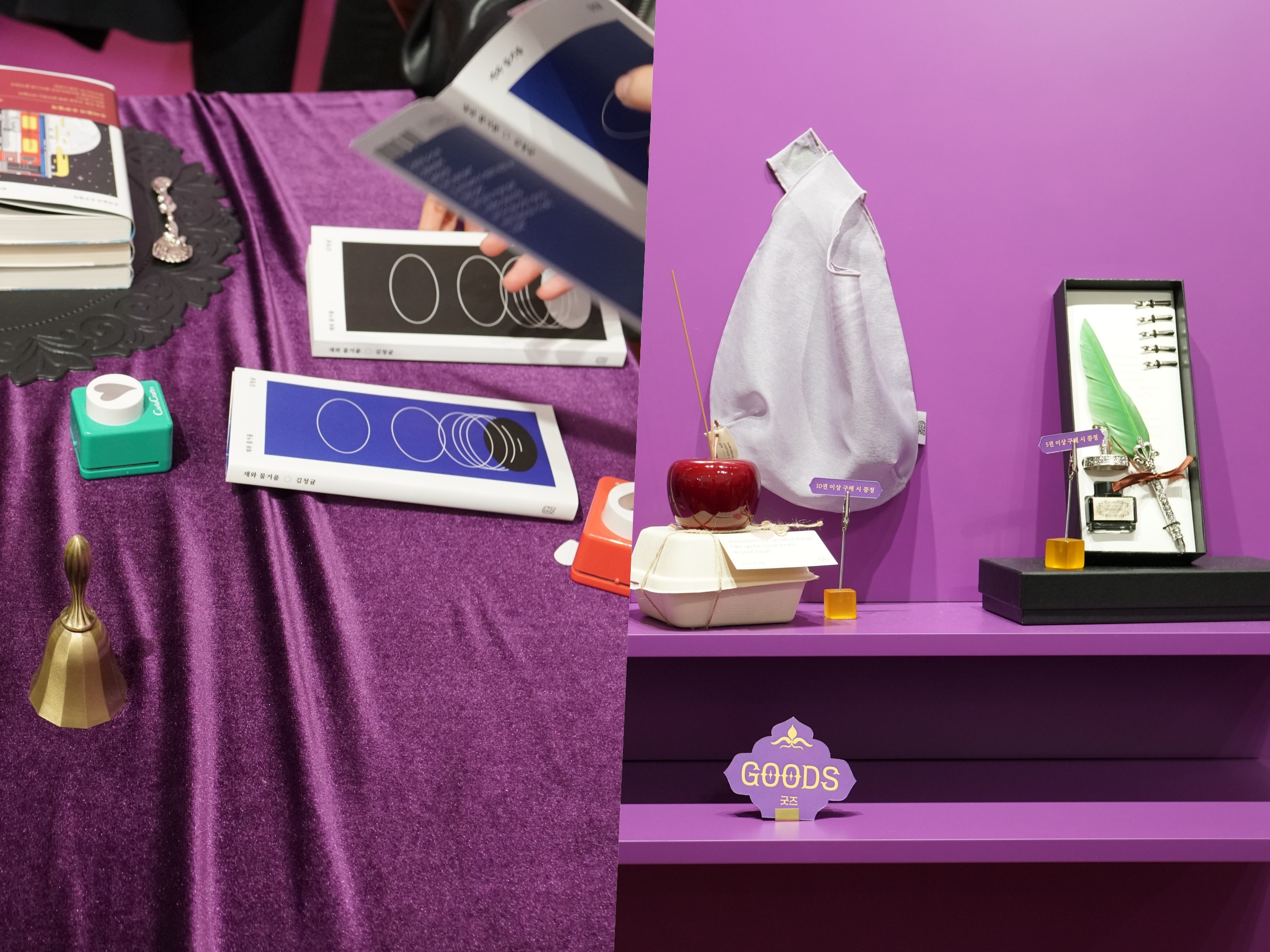 입장하자마자 가장 먼저 시선이 닿는 곳은 안전가옥이다. ‘이상한 이야기들의 궁정 연회’라는 콘셉트로 공간을 꾸몄다. 짙은 보라색 천을 덮은 긴 테이블 위로 붉은 꽃과 뱀 오브제가 놓여 있다. 잔혹동화 속 한 장면을 연출한 듯 오묘한 분위기를 풍기는 건 안전가옥이 장르문학을 전문으로 하는 출판사이기 때문. 흥미로운 서사와 장르적인 쾌감을 추구하는 안전가옥은 종이책에 그치지 않고, 드라마·영화·웹툰 등 다양한 매체로 세계관을 확장하는 방식의 작업을 이어가고 있다.