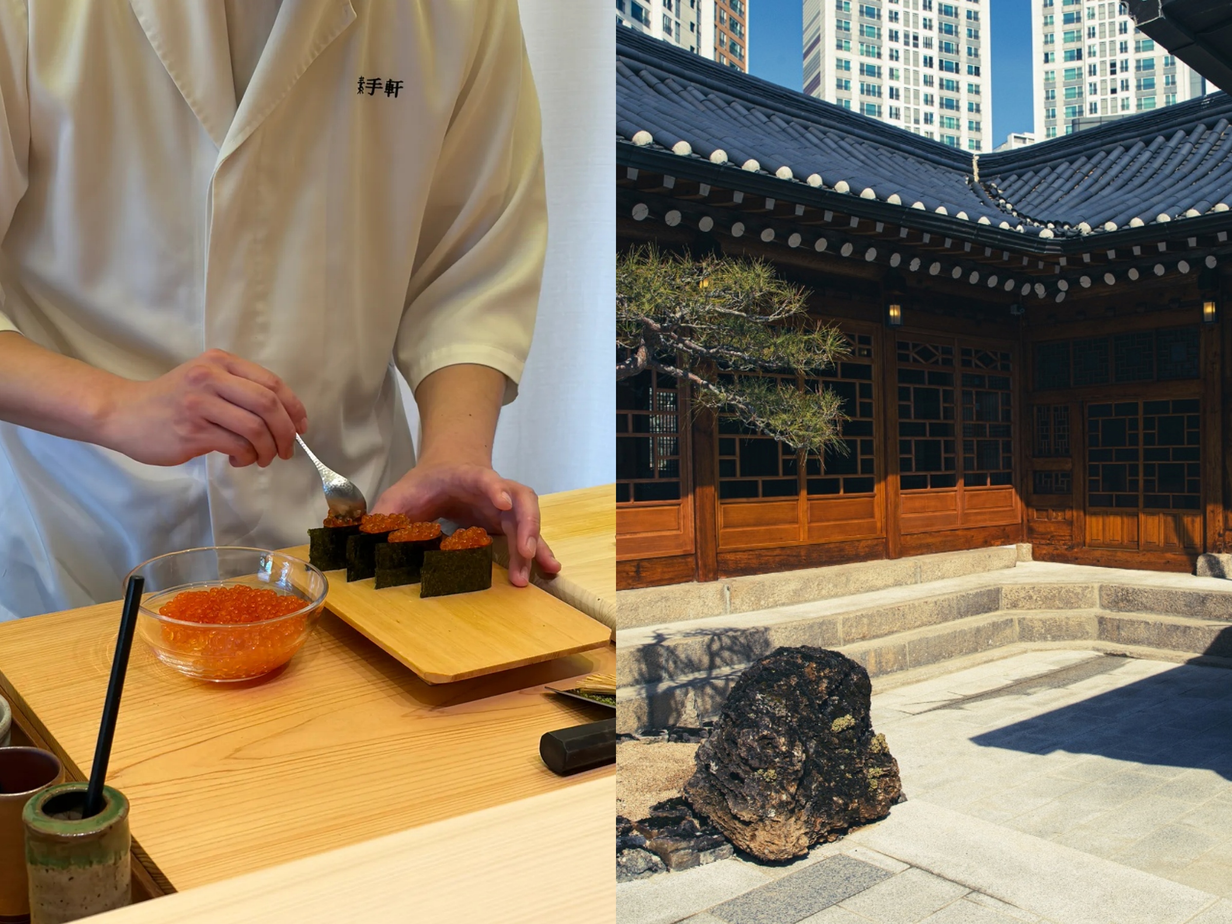 박경재 셰프가 운영하는 스시 오마카세 레스토랑. 국가유산으로 지정된 고택을 리모델링한 공간으로 전통 건축의 여백이 차분한 분위기를 만든다. 8석 규모의 카운터 좌석으로 운영하며 ‘감사한 마음을 손으로 전한다’는 이름처럼 장인의 섬세한 손길을 바라보면서 식사할 수 있다. 코스 구성은 츠마미와 스시의 비율에 따라 런치와 디너가 다르게 전개된다. 스시에 집중하고 싶다면 런치, 츠마미와 스시의 전체적인 흐름을 경험하고 싶다면 디너에 방문하자. 예약은 매달 1일 오전 10시, 전화로만 진행되며 좌석 수가 한정되어 있어 예약이 쉽지 않은 편이다.