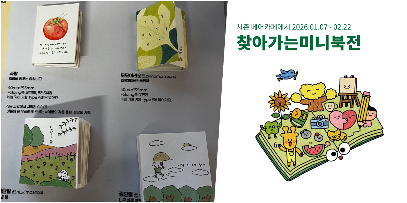손바닥 크기의 책이 ‘전시’가 될 수 있을까. 회전문서재가 기획한 미니북 전시 〈찾아가는미니북전 2026: 취향의 섬〉이 2026년 1월 7일부터 2월 22일까지 서울 서촌 베어카페에서 열린다.