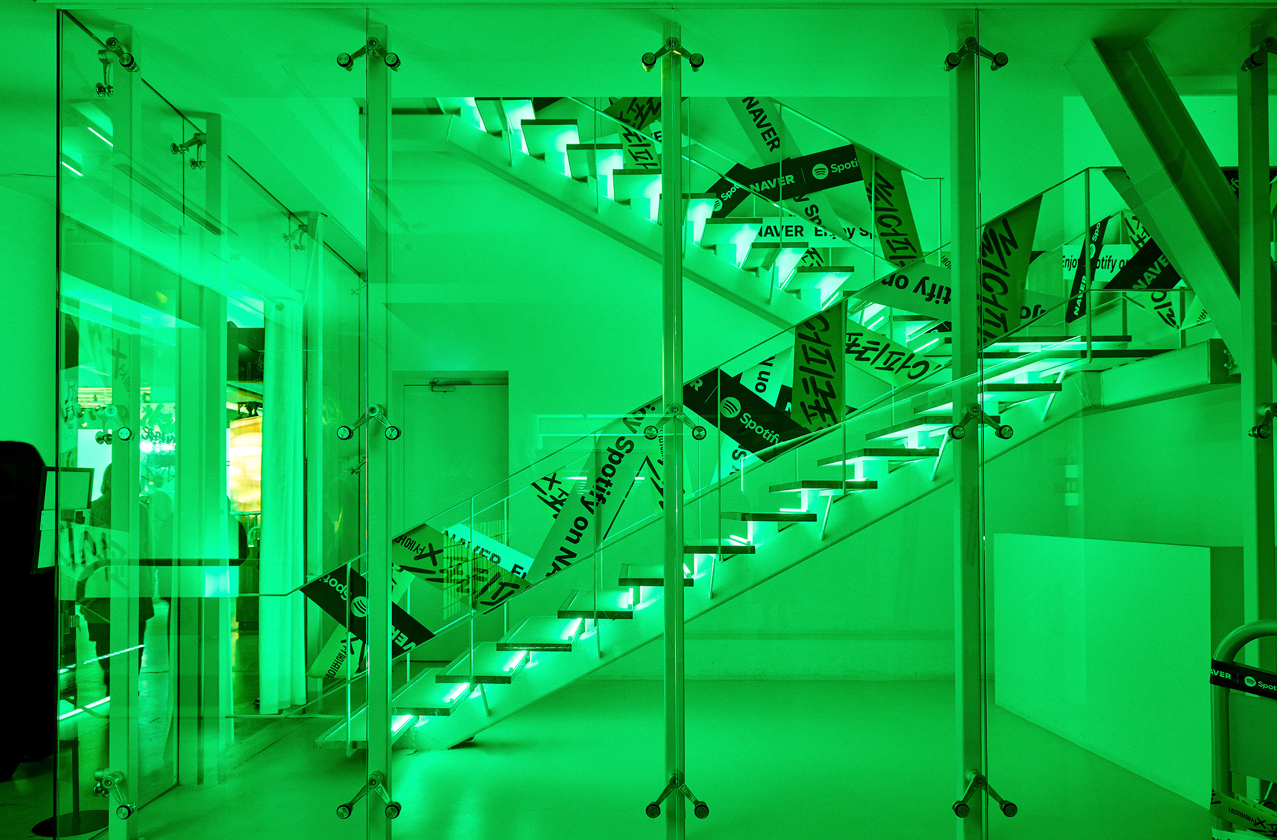 네이버 x 스포티파이 팝업스토어. 건물 외벽 전체를 네온 그린 컬러로 채우는 대담한 디자인으로 지나가는 사람들의 시선을 끌었다.