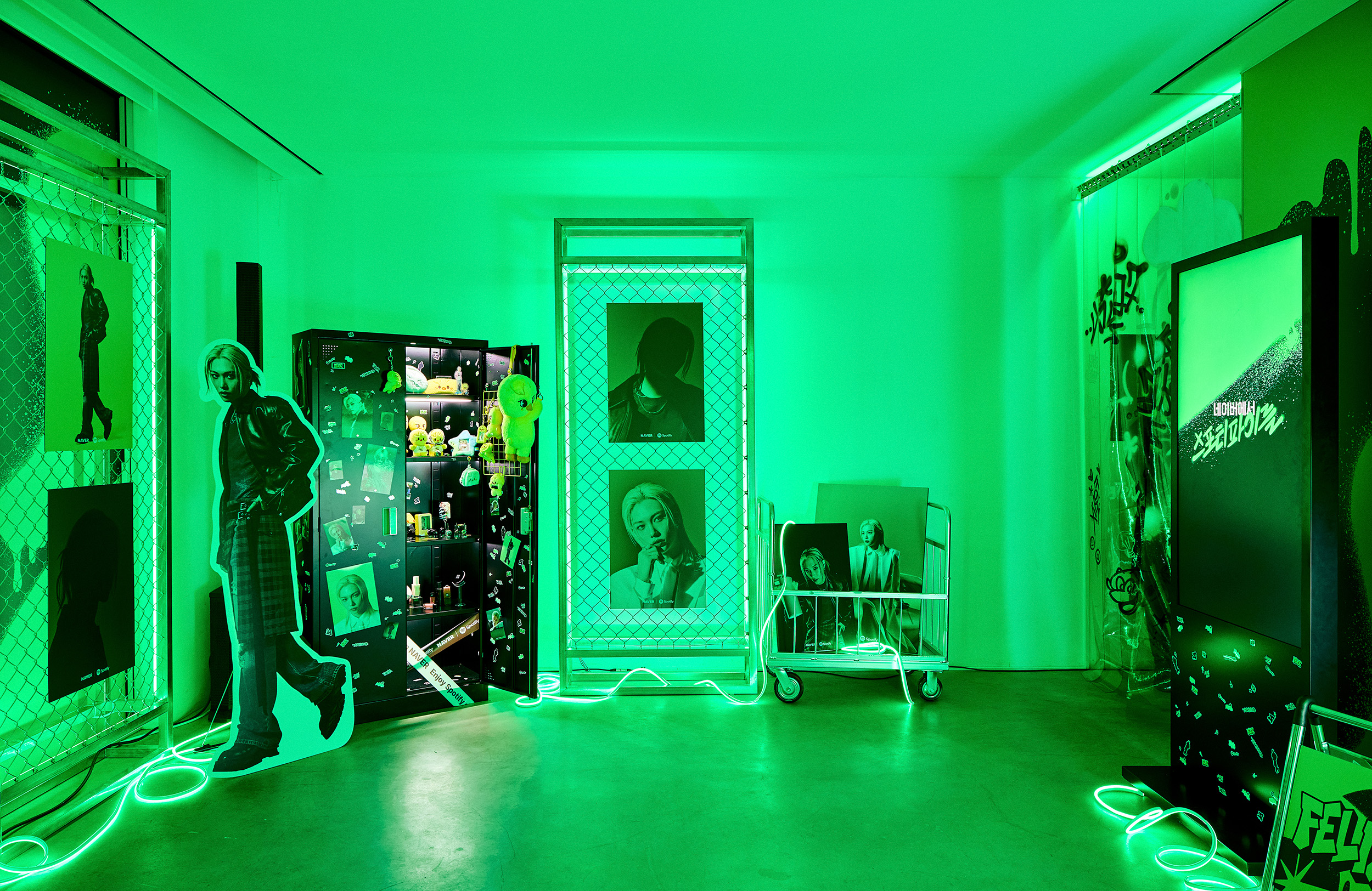 네이버 x 스포티파이 팝업스토어의 경험을 극대화한 요소는 단연코 공간디자인이었다. 이번 팝업스토어의 디자인 핵심은 그래피티로, 입구부터 히든룸까지 모든 공간에 강렬한 그래피티가 그려져 있었다. 형광색으로 빛나는 그래피티로 구성된 입구는 팝업스토어에 입장하는 동시에 공간의 무드와 메시지를 체감하게 했으며, 전체 경험을 더 깊게 몰입할 수 있는 장치로 작용했다. 지도존의 화려한 영상, 어둡지만 화려한 조명, 곳곳에 그려진 그래피티, 안내판과 라인 테이프 등 공간을 채운 디자인 요소들로 인해 팝업스토어는 마치 뮤직비디오에 들어온 것 같은 분위기를 풍겼다.