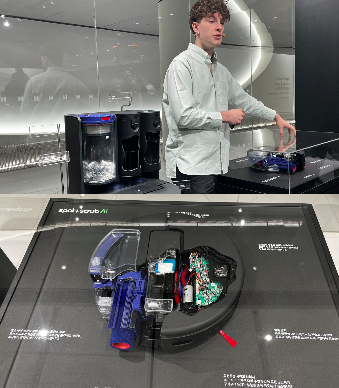 가장 먼저 만날 수 있는 제품은 다이슨 스팟앤스크럽 Ai 로봇 청소기다. 이번 팝업 외관 자체가 이 제품의 실루엣을 형상화할 정도로, 다이슨의 최신 기술의 집약체다. 처음 로봇 청소기가 자동으로 청소하며 불편함을 해소했듯, 이번 모델에서는 첨단 AI 기술로 얼룩을 인식하고 처리하는 방식까지 달라졌다.
