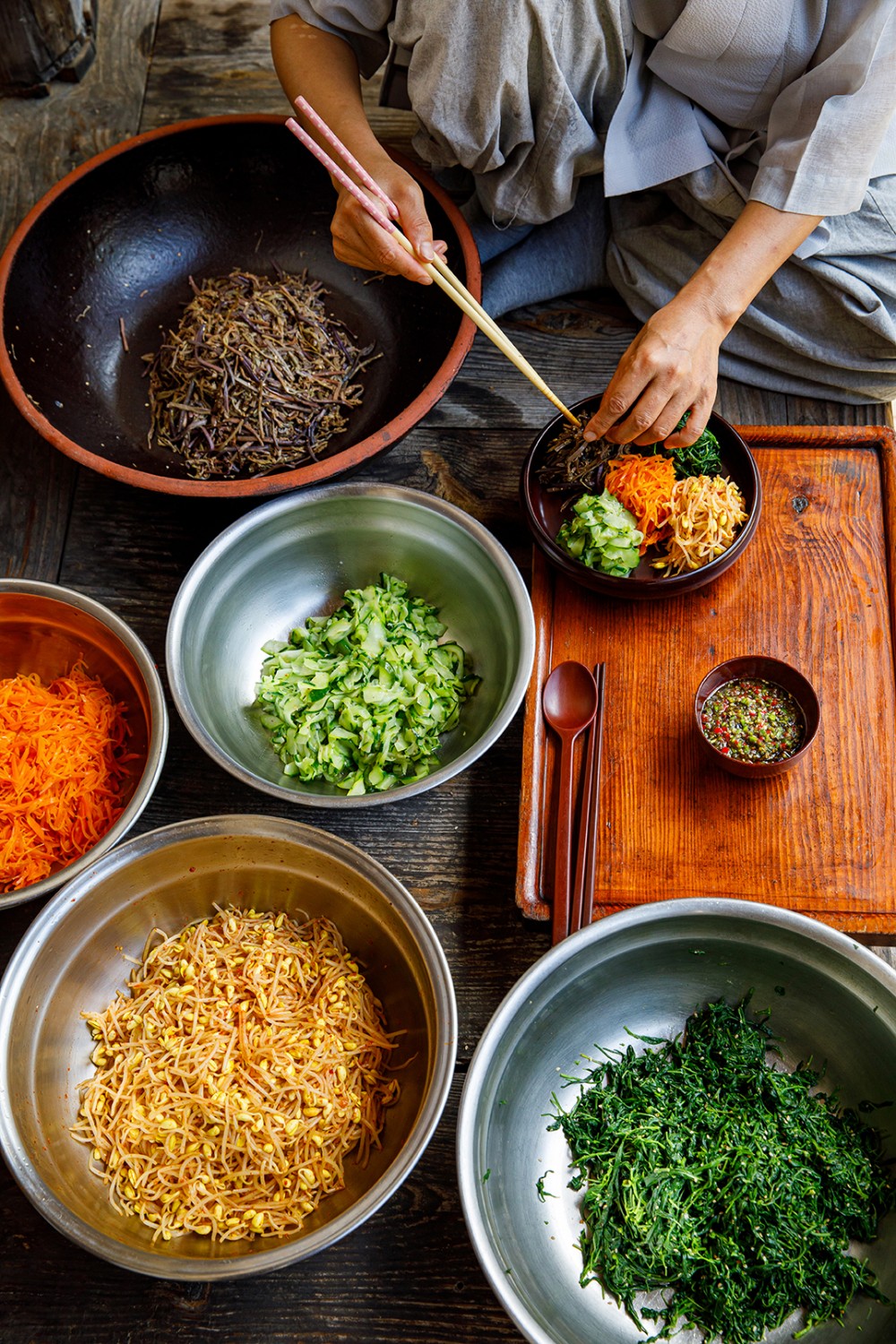 흥미로운 점은 이러한 규칙이 오히려 사찰음식만의 독특한 세계를 만들어왔다는 사실이다. 파, 마늘, 부추는 한식에서 빠지기 어려운 재료다. 특히 김치는 마늘을 넣어야 제맛이 난다는 인식이 강하다. 사찰에서는 마늘과 젓갈 없이 김치를 담근다. 그 대신 홍시 같은 과일의 단맛을 빌리고, 장류가 가진 깊이를 끌어올리는 방식으로 균형을 잡는다. 무엇을 더하지 못해 심심한 음식이 아니라, 덜어낸 조건 안에서 더 섬세한 층위의 맛을 완성해 온 셈이다.
