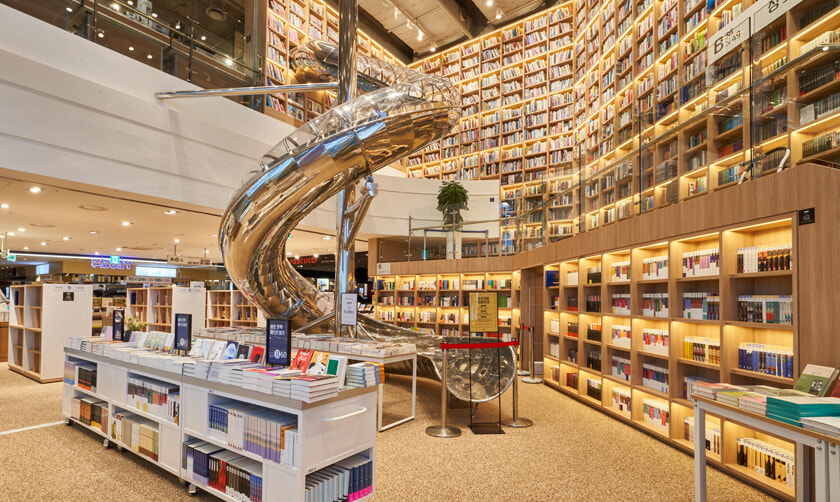 마곡에는 벌써 두 개의 대형서점이 들어서 있다. 그중 하나인 YES24 강서 NC점은 천장까지 이어지는 8m 높이의 책장과 전면 유리창을 통해 마곡동을 내려보는 파노라마 뷰로 서점 이상의 경험을 할 수 있는 곳이다. 서점을 천천히 돌아다니다가 마음에 드는 책을 발견했다면 곳곳에 놓인 테이블과 좌석에 앉아 미리 읽어보자. 옷처럼 책도 나에게 맞는 것이 따로 있으니까 말이다. 한편, 은색의 커다란 미끄럼틀에 계속 시선이 가는 자신도 발견하게 된다. 8층과 9층을 연결하는 15m 길이의 구불거리는 미끄럼틀은 아쉽게도 7세 미만 어린이만 이용할 수 있다.