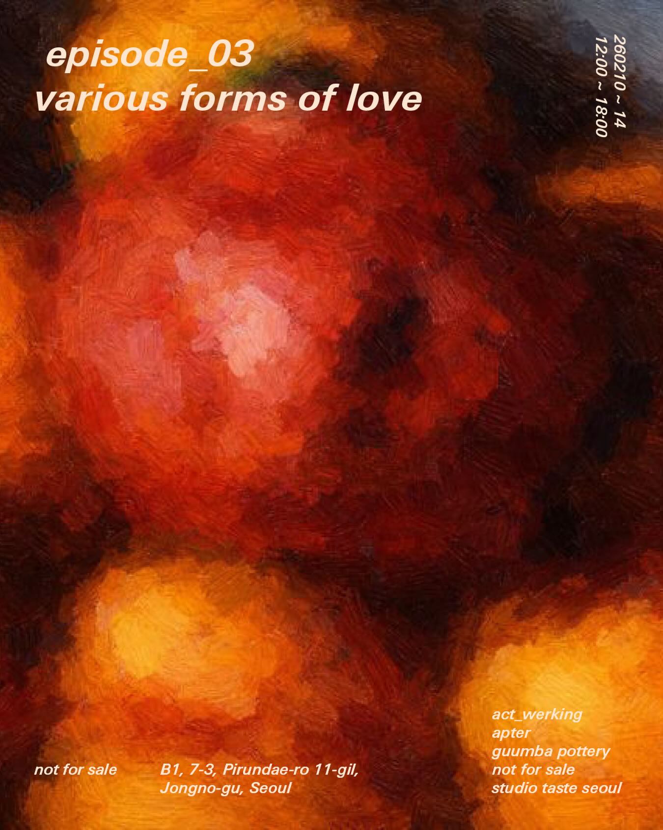 not for sale이 선보이는 세 번째 에피소드 ‘Various forms of love’는 공간 운영자가 평소 애정해온 브랜드, 스튜디오, 작가 그리고 하나의 공연을 엮어 사랑의 여러 얼굴을 보여준다. 사랑하는 이에게 초콜릿을 건네는 밸런타인데이를 앞두고, 사랑의 질감과 온도, 맛을 각기 다른 방식으로 경험할 수 있도록 구성했다.