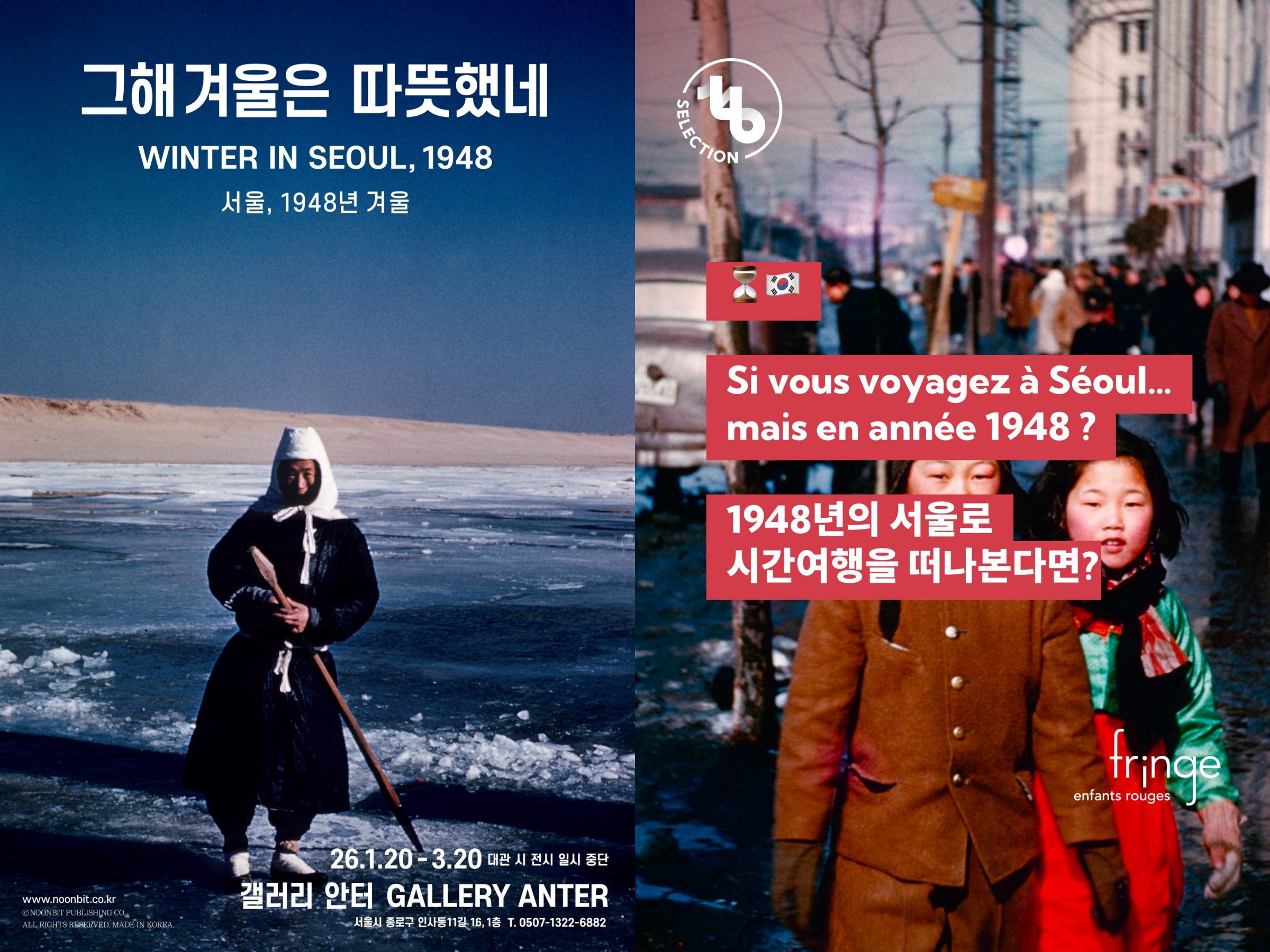 〈그해 겨울은 따뜻했네〉는 1948년 겨울, 서울에 내린 기록적인 폭설 속에서 촬영된 컬러 사진 30점을 소개하는 전시다. 1989년 설립된 사진 책 전문 출판사 눈빛이 소장해 온 이 연작은 해방 직후이자 분단을 앞둔 시기의 풍경을 담고 있다. 촬영자는 밝혀지지 않았지만, 일부 사진에 등장하는 인물로 미군정 관계자의 존재가 짐작된다. 사진은 점령군의 시선을 드러내기보다 설빔을 입은 아이들, 눈 쌓인 거리를 오가는 사람들, 각자의 하루를 이어가는 도시의 표정을 차분히 따라간다. 이번 전시는 프랑스 파리와 서울에서 동시에 선보이는 프로젝트이기도 하다. 한불 수교 140주년을 맞아 파리 마레 지구의 갤러리 프린지 Enfants Rouges에서도 동일한 사진 연작이 소개되고 있다. 갤러리 안터의 전시는 3월 20일까지 이어진다.