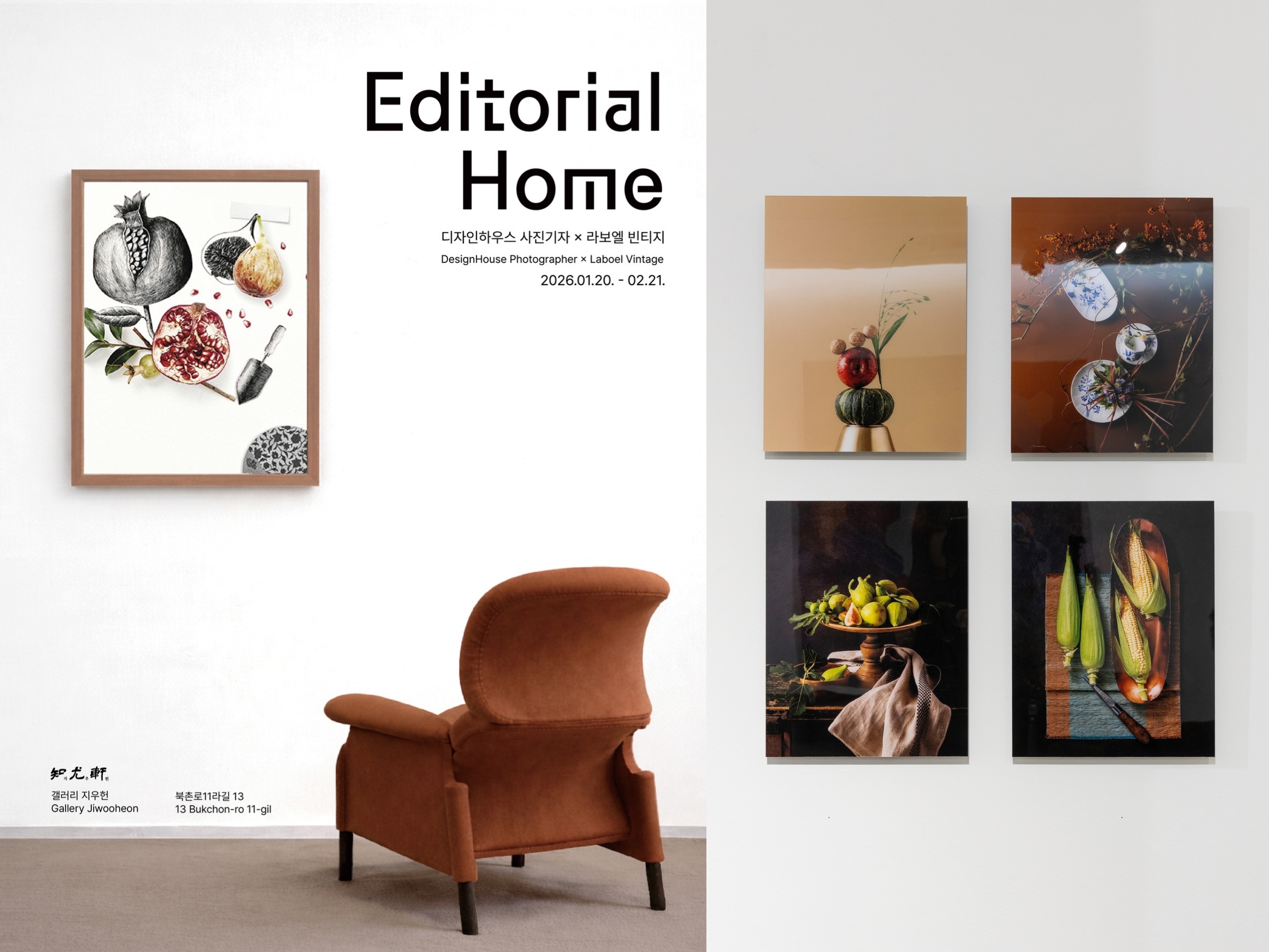 갤러리 지우헌에서 사진과 빈티지 가구를 함께 조명하는 전시 〈Editorial Home〉이 열린다. 이번 전시는 디자인하우스 매거진을 대표하는 사진기자 4인과 유럽 빈티지 가구 브랜드 라보엘 빈티지가 함께한다. 참여 작가 이우경, 이기태, 이경옥, 이창화는 『행복이 가득한 집』, 『월간 디자인』, 『럭셔리』, 『스타일H』 등 주요 매거진을 통해 상업 사진의 최전선에서 활동해 왔다. 각기 다른 미감과 촬영 방식으로 공간과 사물, 음식과 테이블 풍경 등을 다뤄온 이들은 정보와 연출 사이를 유연하게 넘나든다. 전통 요리와 계절의 풍경, 식재료와 생활자기 등 서로 다른 시선이 한 공간 안에서 교차하며, 마치 매거진 지면을 살펴보는 듯한 감각을 만든다.