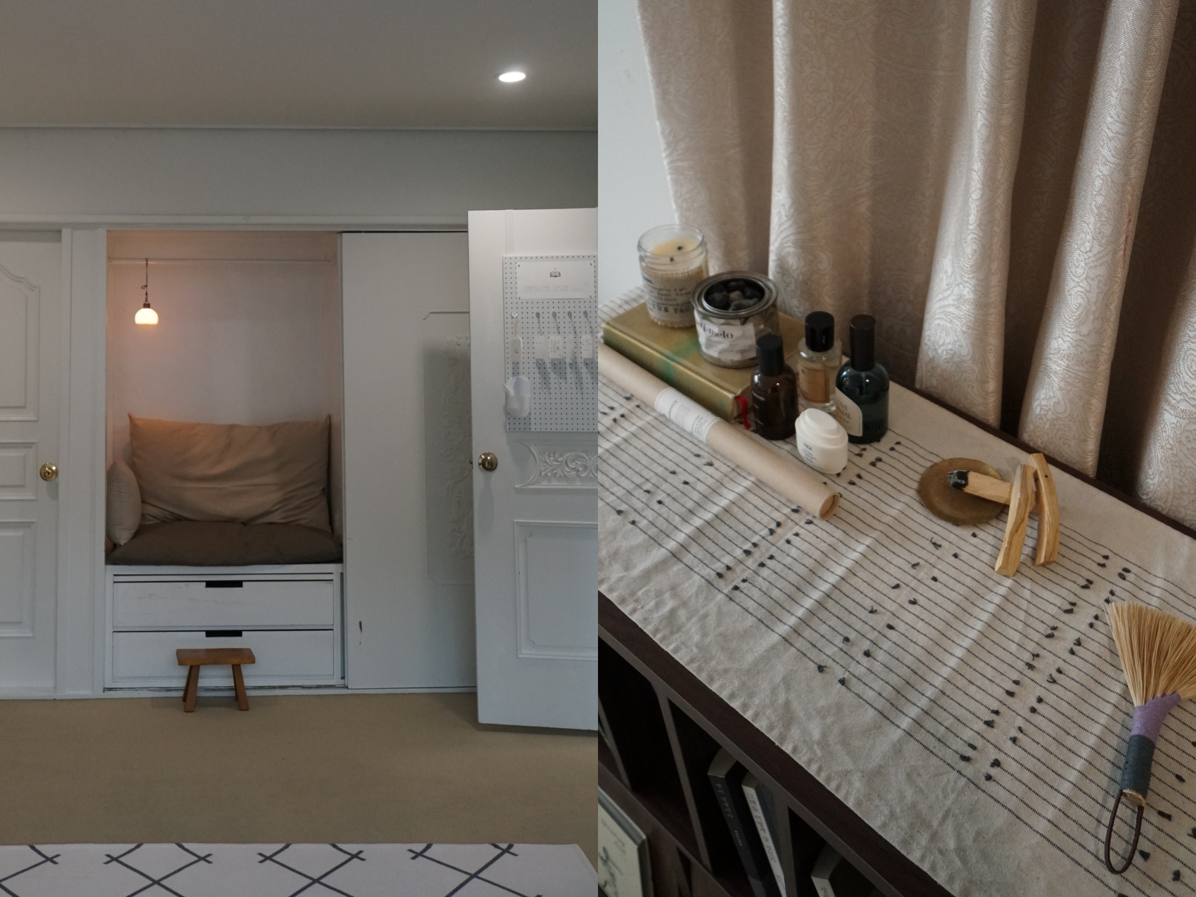 붙박이장을 활용한 독서 공간과 자유롭게 사용할 수 있는 향 제품들