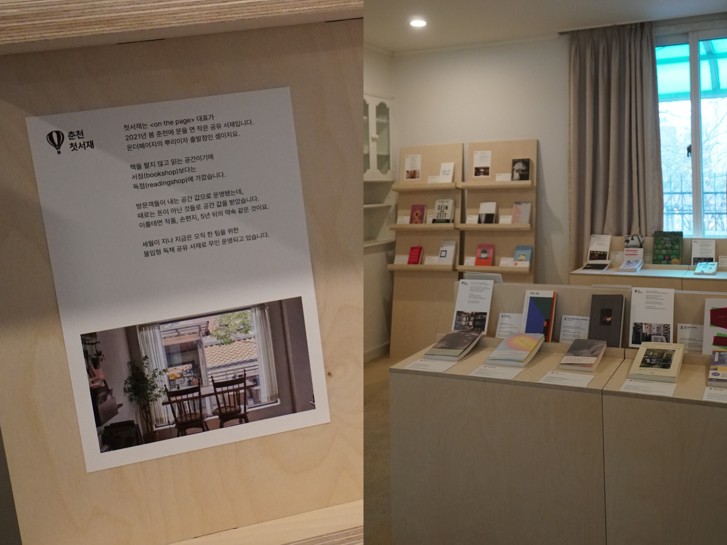 같은 층 안쪽 공간에는 도서 큐레이션이 마련돼 있다. 강릉 윤슬서림, 제주 만춘서점, 광주 치읓의자리 등 로컬 경험을 풍부하게 만들어 온 독립 서점 열두 곳이 ‘2월의 책’을 다섯 권씩 추천한다. 책 옆에는 서점의 이름과 책방지기 추천사가 함께 놓여 있어, 자연스럽게 타인의 독서 경험을 들여다보게 된다. 독립 서점 중에는 강원도 춘천의 ‘첫서재’도 포함돼 있다. 첫서재는 온더페이지 남형석 대표가 2021년에 문을 연 공유 서재다. 책을 판매하는 서점이 아니라 독서를 권하는 곳이었다는 점에서 온더페이지의 뿌리와도 같은 공간이다. 각 서점이 큐레이션한 도서는 판매용이 아닌 열람용으로 팝업 현장에서만 읽을 수 있다.