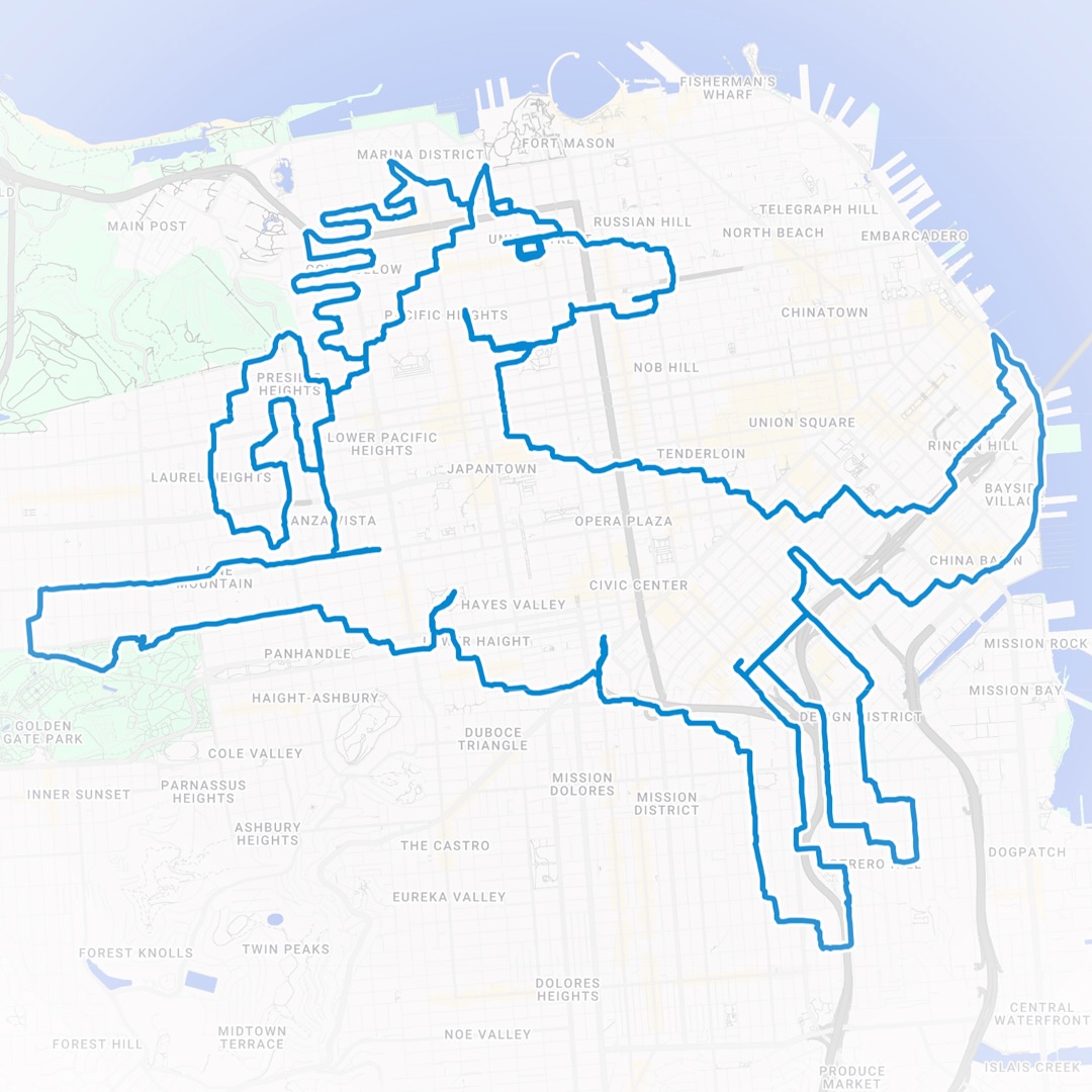 러닝이 일상적인 운동으로 자리 잡으면서, 경로 자체를 하나의 이미지로 설계하는 ‘스케치런’도 함께 주목받고 있다. 여의도를 한 바퀴 돌면 완성되는 고구마런, 경복궁과 광화문 일대를 잇는 댕댕런, 남산공원 주변을 따라 그려지는 하트런 등이 대표적인 코스다. 갑작스러운 유행은 아니다. 시작은 일본이다. 2008년, 타카하시 야스시(高橋 康)는 청혼을 위해 약 7,000km에 이르는 아트워크를 완성했고, 이를 계기로 꾸준히 작업을 이어나가 2024년 ‘일본 GPS 아트 협회’ 설립으로까지 확장됐다. 미국 샌프란시스코를 거점으로 활동하는 레니 모건(Lenny Maughan) 역시 지난 10여 년간 도시를 캔버스 삼아, GPS 기록이라고는 믿기 어려울 만큼 정교한 이미지를 그려왔다.