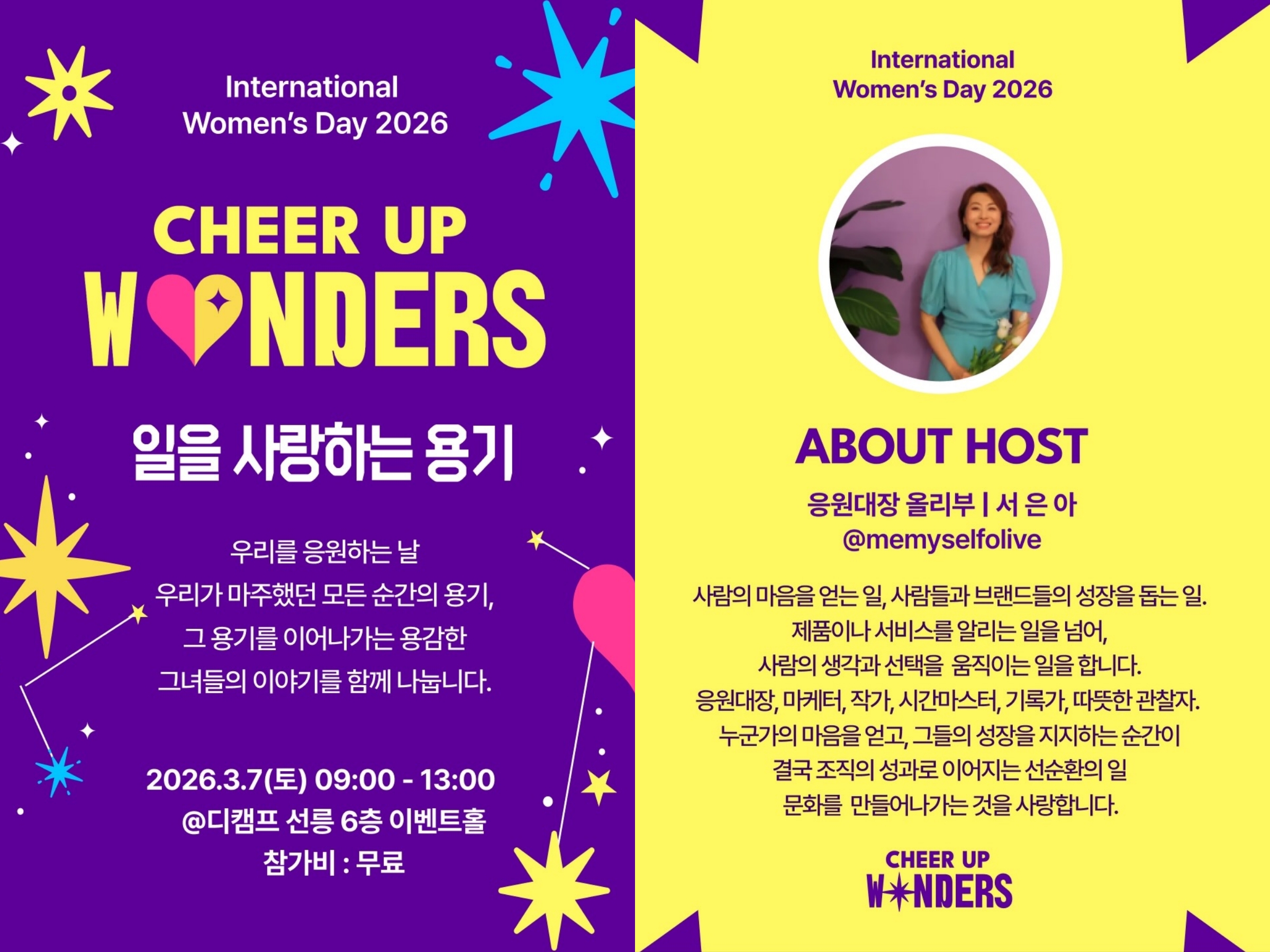3월 7일, 서울 선릉에 있는 디캠프에서 〈Cheer Up, Wonders – 일을 사랑하는 용기〉가 열린다. 세계 여성의 날을 맞아 일을 사랑하는 마음과 그 과정에서 필요한 용기를 나누고, 서로에게 응원을 건네는 자리다. 행사는 ‘응원대장 올리부’ 서은아와 팀 올리부가 주최한다. 마케터이자 작가로 활동한 그는 사람과 브랜드의 성장을 돕는 일을 꾸준히 이어오며, 개인의 경험과 일의 의미를 연결하는 프로젝트를 이어왔다.