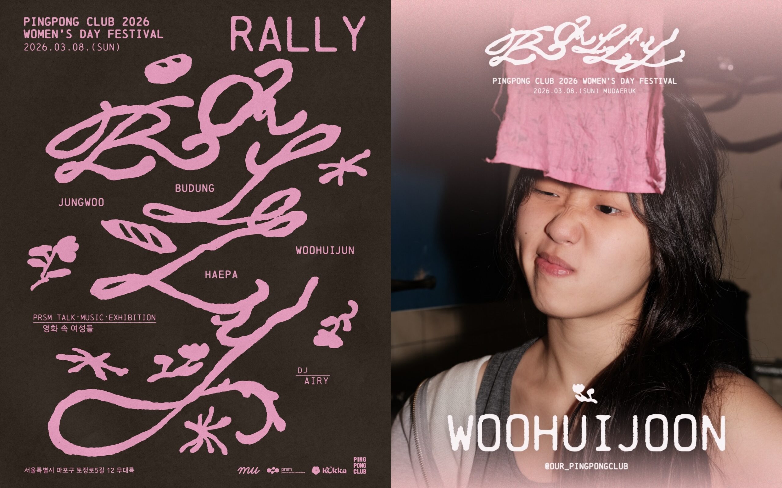 서울 마포구 복합문화공간 무대륙에서 3월 8일 단 하루, ‘RALLY : 2026 WOMEN’S DAY FESTIVAL’이 열린다. 같은 마음이 같은 방향을 향할 때 생기는 느슨한 연대, 그 감각을 ‘랠리’라는 단어로 번역했다. 이번 행사의 중심에는 핑퐁클럽이 있다. 홍대 앞 인디 문화의 에너지를 바탕으로, 특정 지역과 장면에 갇히지 않는 공연 문화를 상상해 온 팀이다. 마포 바깥의 사람과 공간, 때로는 자연까지 찾아가며 ‘지역 간의 핑-퐁, 사람 간의 핑-퐁’을 이어왔다는 소개처럼, 이들은 음악을 매개로 경계를 건너는 방식을 꾸준히 실험해왔다. 무대에는 버둥, 우희준, 정우, 해파, DJ 애리가 오르며, 〈조인성을 좋아하세요〉, 〈연애 빠진 로맨스〉를 만든 정가영 감독의 토크, 여성 인물 중심의 영화 제목을 세 명의 여성 디자이너의 시선으로 다시 쓴 타이포그래피 전시도 함께 펼쳐진다.