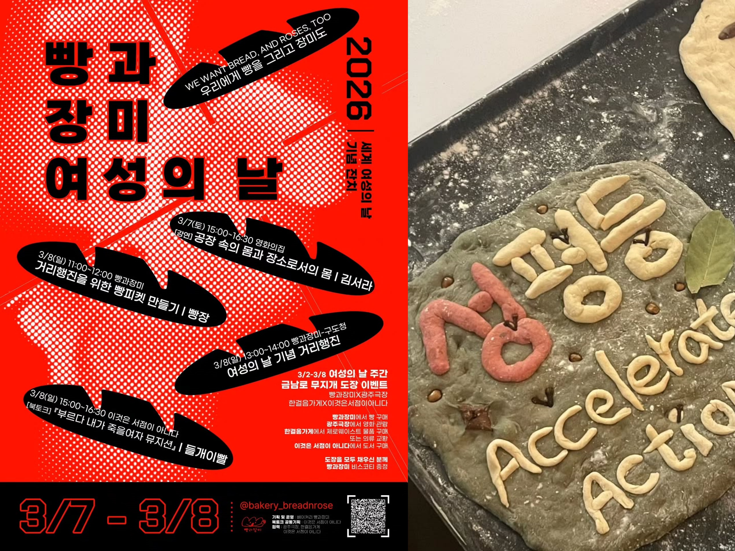 광주 동구 충장동에 자리한 작은 베이커리 ‘빵과 장미’. 세계 여성의 날을 상징하는 두 단어를 그대로 이름에 담은 이곳은 깜빠뉴와 치아바타, 바게트 같은 식사용 발효빵을 굽는 동네 빵집이자, 해마다 3월이 되면 사람들이 자연스럽게 모여드는 장소다. 올해도 세계 여성의 날을 기념하는 잔치가 3월 7일부터 8일까지 양일간 열린다. 가게 앞에서 출발해 충장로 우체국을 지나 구시청으로 이어지는 거리 행진과 북토크가 예정돼 있다. 무엇보다 눈길을 끄는 프로그램은 ‘빵 피켓 만들기’다. 종이나 플라스틱 대신, 먹을 수 있고 결국 자연으로 돌아갈 소재로 피켓을 만든다. 거리에서 외치고 싶은 문장을 말랑한 반죽 위에 새기고, 간단한 제빵 과정을 익혀 직접 구워내는 방식이다.