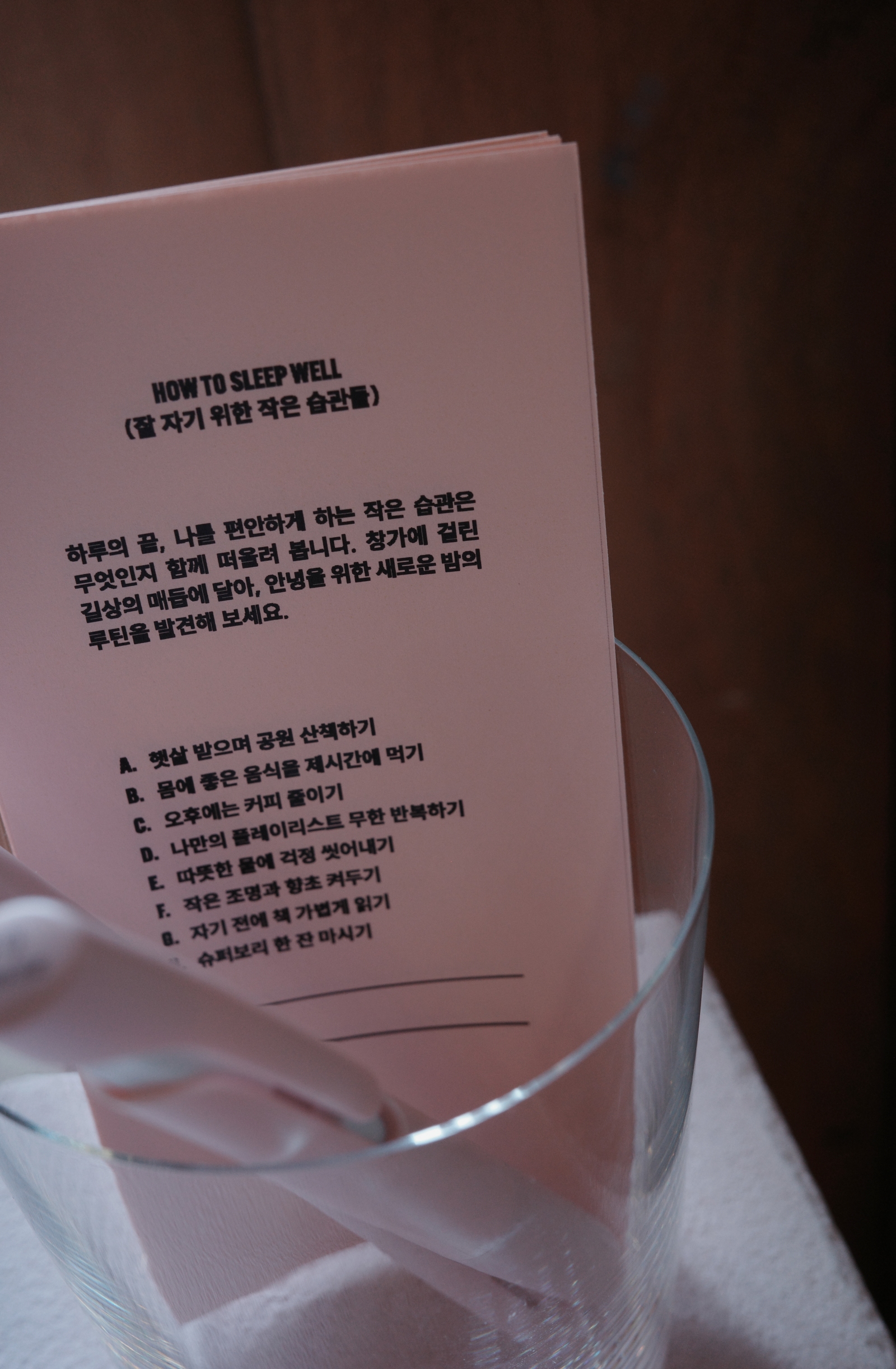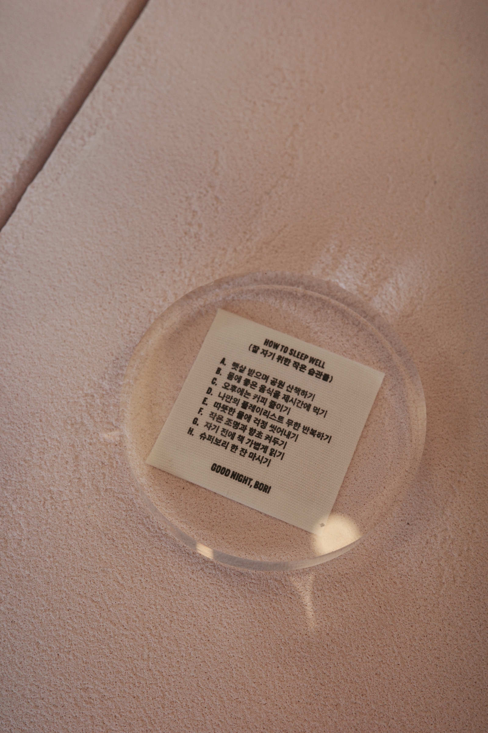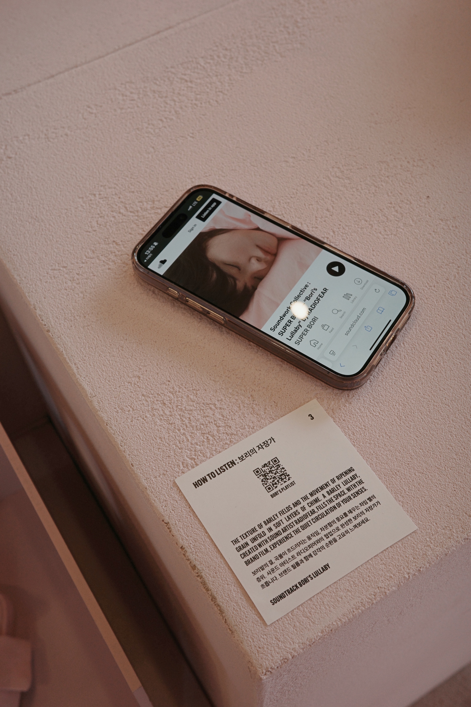 전시 중반부에는 사운드 아티스트 라디오피어와 협업한 공간이 등장한다. 보리밭의 결, 곡물이 흐드러지는 움직임, 차임벨 소리가 겹겹이 쌓인 음향이 공간을 채운다. ‘굿나잇 보리(Good Night, Bori)’ 콘셉트로 제작된 브랜드 필름을 함께 감상하며 몸에 쌓인 긴장을 서서히 풀어낸다. 이후 공간에서는 ‘잘 자는 습관’을 주제로 한 작은 기록 장치가 마련돼 있다. 하루의 끝을 편안하게 만드는 나만의 루틴을 떠올리고 메모를 남기는 곳이다. 다른 관람객들이 남긴 숙면 팁을 읽으며 새로운 밤의 습관을 발견하는 재미도 있다.