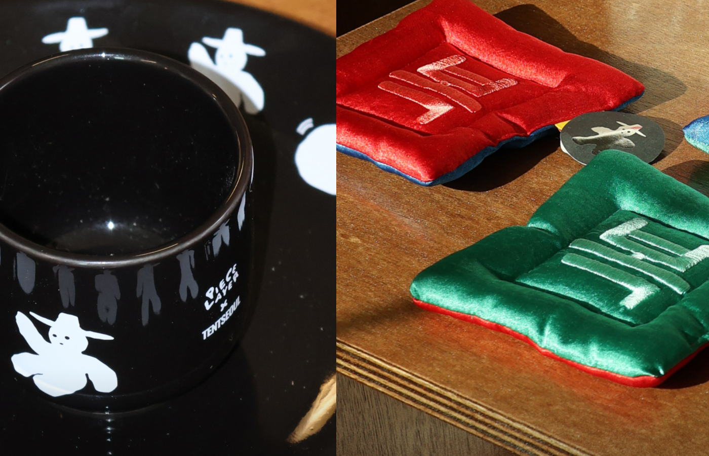 한국인과 외국인 모두에게 직관적으로 사랑받는 제품은 수집가무무의 봉제 키링 ‘선비콩’이예요. 한국적인 유머를 바탕으로 ‘콩쥐’라는 캐릭터 시리즈를 선보이는데, 콩처럼 자그마한 인형이 갓, 패랭이, 봇짐 같은 한국 전통 요소를 지닌 모습이 사랑스러워요. 디자인 브랜드 ‘아무개씨’의 제품은 다양하게 인기가 있어요. 비단 방석에 자수로 ‘복(福)’을 새긴 코스터는 그 의미를 알게 된 외국인 관광객들이 기념품처럼 여러 개 구매해요. 흥미로운 점은 방문객 모두가 토비에게 호감을 보인다는 점이에요. 입점 브랜드와 토비 그래픽을 활용한 협업 제품을 만들고 있는데요. 특히 ‘텐트서울’에서 제작한 ‘토비 소주잔 세트’는 많은 고객이 구매하는 제품이에요. 한국의 술 문화와 토비의 유머가 함께 담긴 제품이라서 그런 것 같아요.