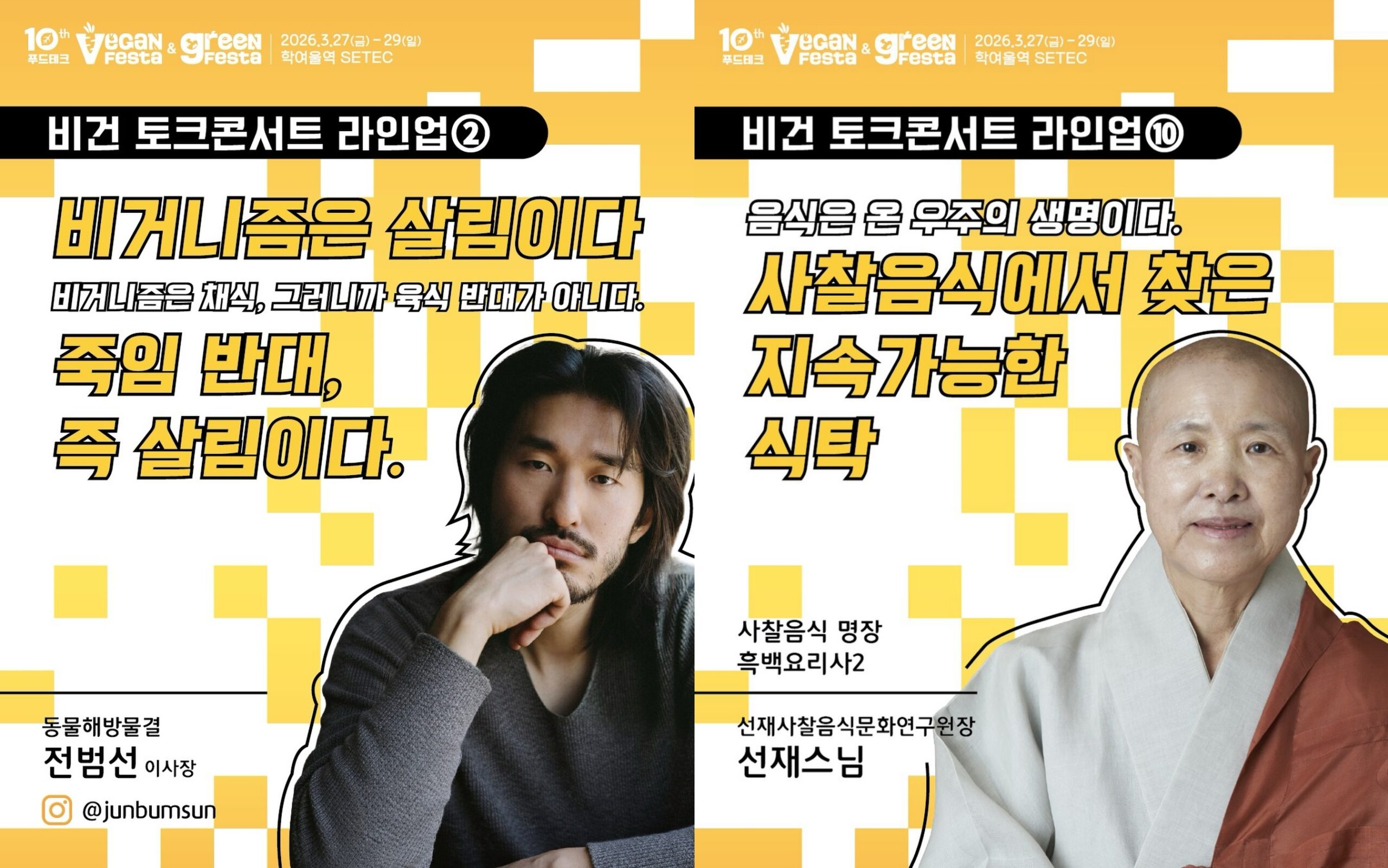 비건과 친환경에 대해 보다 폭넓은 시선을 얻고 싶다면, 토크 콘서트를 주목하자. 주말 양일간 이어지는 프로그램에서는 비건을 둘러싼 다양한 관점이 교차한다. 비건 제품을 개발하는 브랜드 관계자부터, 비건 라이프를 실천해온 창작자와 콘텐츠 기획자, 환경과 지속가능성을 주제로 활동하는 연사들이 참여해 각자의 경험을 공유한다. 특히 넷플릭스 프로그램 〈흑백요리사 2〉를 통해 사찰음식을 대중적으로 알린 선재스님이 참여해, 재료 본연의 맛과 지속 가능한 식문화에 대한 이야기를 전할 예정이다. 모든 토크 프로그램은 별도의 예약 없이 현장에서 무료로 입장할 수 있다.