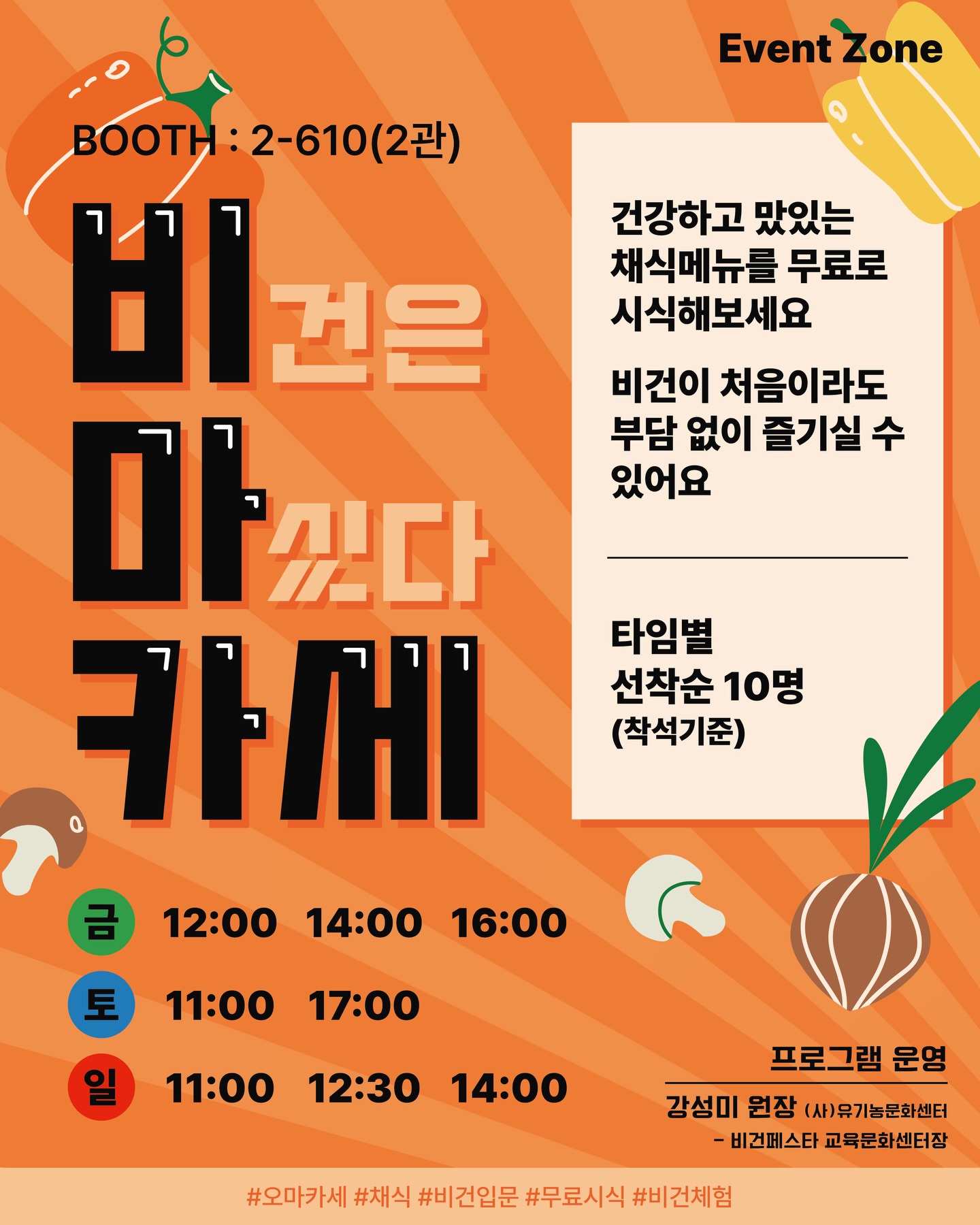 비건 입문자를 위한 시식 이벤트 ‘비마카세’도 마련됐다. 오마카세 형식을 차용해 채식 메뉴를 코스로 풀어낸 프로그램으로, 비건 메뉴를 보다 입체적으로 경험할 수 있다. 낯선 재료와 조합에 대한 안내도 함께 이뤄져, 처음 접하는 이들도 부담이 없다. 프로그램은 2관 부스(2-610)에서 진행되며, 회차별 선착순 10명만 참여할 수 있어 빠른 마감이 예상된다. 진행은 (사)유기농문화센터 소속이자 비건페스타 교육문화센터장을 맡고 있는 강성미 원장이 맡는다. 오랜 경험을 바탕으로, 재료 본연의 맛을 살린 채식 요리와 건강한 식문화에 대한 이야기를 함께 전할 예정이다.