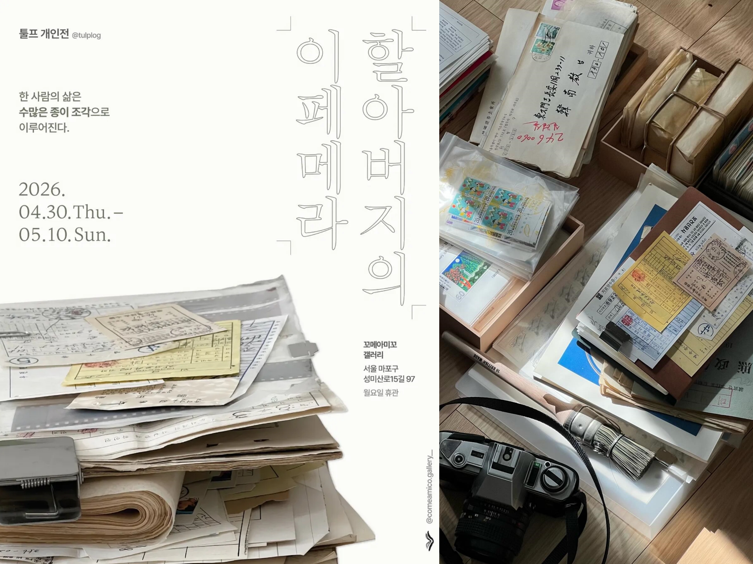 한 사람의 삶을 종이의 흔적으로 따라가는 전시 〈할아버지의 이페메라〉가 연희동 꼬메아미꼬 갤러리에서 열린다. 이번 전시는 봉투, 우표, 손글씨 메모, 정리되지 않은 인쇄물처럼 사소하게 흩어진 기록들을 통해 한 개인의 시간을 더듬는다. 작가 툴프는 할아버지에게서 물려받은 아카이브를 바탕으로, 남겨진 기록이 타인의 손을 거쳐 어떤 상태로 머무는지를 조용히 보여준다. 기록은 과거에 머무르지 않고 현재의 감각으로 이어지며, 관람자는 타인의 흔적을 읽는 동시에 자신의 기억을 겹쳐 보게 된다. 전시장에는 관람객이 직접 흔적을 남기고 일부를 가져갈 수 있는 ‘Archive Slip’ 참여 장치도 마련돼, 개인의 기록이 전시의 일부로 축적된다. 4월 30일부터 5월 10일까지 진행되며, 월요일은 휴관이다.